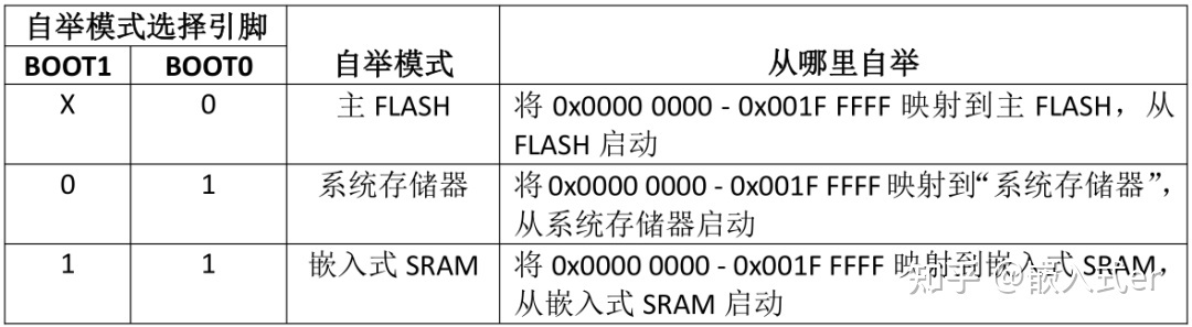 - 从主 Flash 启动:将主 Flash 地址 0x0800 0000 映射到 0x0000 0000,代码启动后相当于从 0x0800 0000 开始运行,使用 JTAG 或者 SWD 模式下载程序时会下载到 Flash 并从中启动。