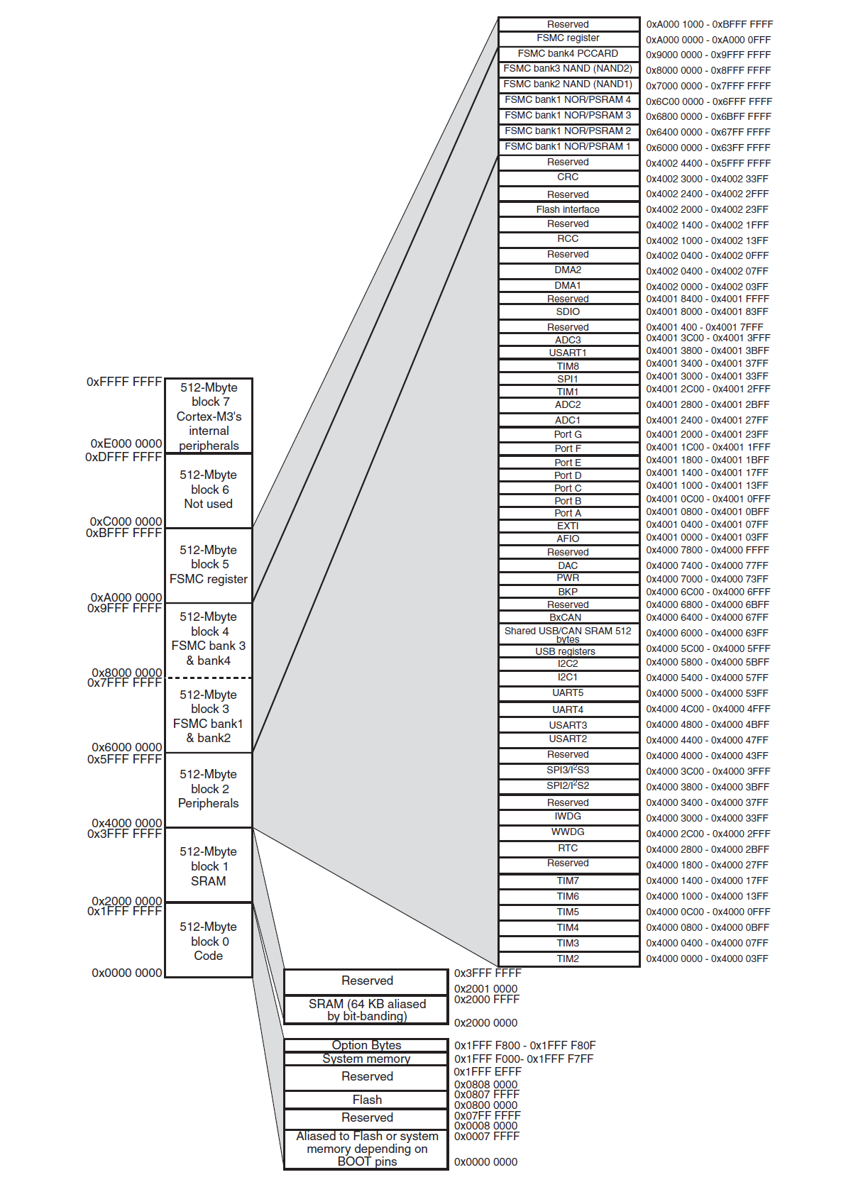 STM32 有 32 根地址线,寻址范围为 0x0000 0000~0xFFFF FFFF,共计 4G 个地址的二进制数,一个地址对应一个字节的存储单元(注意是按 byte 而不是 bit 编制),故 32 位的地址线可以寻址 4GB 的逻辑内存。(注意:STM32 的 32 不是指有 32 根地址线,而是指 MCU 内核在处理数据时每次可以处理的数据位宽为 32bit,也由于这个原因,STM32 内部寄存器都是 32 位的)