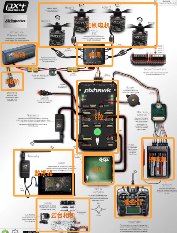 多旋翼飞行器的硬件组成包括自驾仪系统(自驾仪、GPS 接收机)、动力系统(电机、电调、电池、螺旋桨)、遥控系统(遥控器、接收机)、机架系统(机身、机臂、起落架)。其中,电机电调电池、遥控器和接收机,在 RC 遥控车中也是核心部件,在原理、参数和选型上相通。