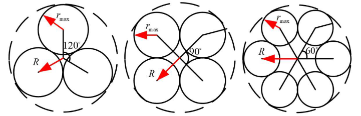 旋翼飞行器尺寸与机臂数和螺旋桨尺寸相关,设机臂数量\(n\),机臂夹角\(\theta = \frac{360}{n}\),机架半径\(R\),螺旋桨半径\(r\),则