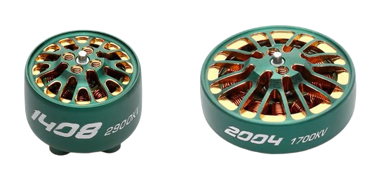 电机以及螺旋桨的尺寸要与旋翼飞行器整体尺寸相匹配,一般来说,三寸机选择 1106 等型号,五寸机选 2204、2207、2306 等型号(三寸和五寸都是指螺旋桨尺寸,且单位是英寸)。因此,选择电机优先考虑尺寸,其次考虑 KV 值。平稳飞行的飞机选低 KV,竞速飞机选高 KV。同时,选 KV 值需要考虑电池的放电倍率,也就是 C 数。C 数乘以容量为电流,所有电机最大电流之和需要小于电池的放电电流,否则电机性能会受电池制约。另外,电机输出轴的轴径有 1.5mm 和 5mm 之分,桨叶的孔位需要与之适配。目前主流的飞行器电机品牌有 T-Motor 的 F60 系列,乘风系列,致盈动力,银燕,双飞等。