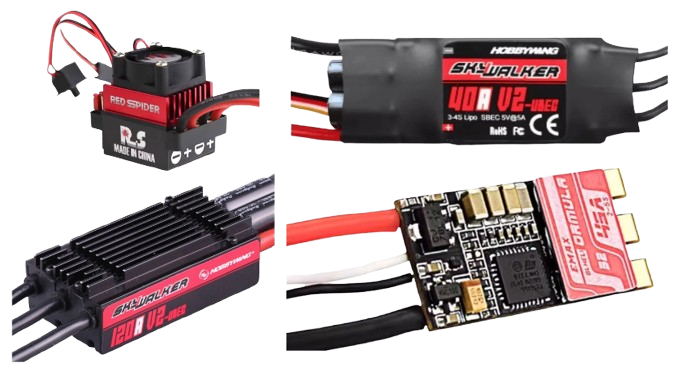 电调有四合一电调和分体电调,电调最主要的参数是额定电流,代表室温下允许持续通过的最大电流,决定了能带的动多大的电机,需要综合考虑电机最大电流和电池放电倍率选择,可大不可小,一般取稍大于(1.2 倍左右),避免持续的峰值工况。比较科学的选择顺序是先电机再电调最后电池。对于电压,电调上一般会标注推荐的电压,电压过低电调不会启动,电压过高在没有超压保护的情况下可能会烧掉电调。过热、堵转、电机电调不匹配(电机要求大于电调提供)、超过标称电压的电池、环境温度过高等都可能烧毁电调。有的电调内部含有降压模块并引出一路低压输出(BEC 输出)给其它低压设备供电,BEC 输出不受电池电压影响。有的还含有高压 BEC 输出,主要用于提升舵机性能(有的舵机性能在低压和高压供电下有显著差别)。