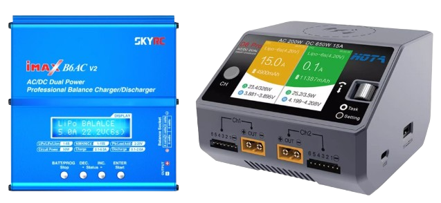 平衡充电器的原理是通过供电口输入大电流,再通过平衡充调整电芯间的压差;充电时要将供电口和平衡头同时接上,后选择对应的电池种类、电压和电流。平衡充有经典便宜的 B6 或 B6AC(B6AC 就是 B6 加内置电源,正版的有 SKYRC 标识),也有智能高级的 HOTA D6pro 等。选择充电器时需要确定充电器是内置电源还是需要额外电源,很多充电器需要配备额外的直流开关电源来供电,而开关电源只推荐有电工经验的使用,需要注意接线方式。