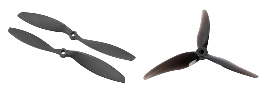 螺旋桨型号由四位数字描述,前两位数字表示直径,后两位数字表示螺距,单位均为英寸(1 英寸=25.4mm)。螺旋桨尺寸需根据飞行器的尺寸来确定。旋翼飞行器的尺寸用轴距,即机臂对角线的长度来衡量。螺距定义为螺旋桨在不能流动的介质中旋转一圈时前进的距离,是衡量螺旋桨推进效率和性能特性的重要参数(螺旋桨是一个扭曲的翼型结构,每个横截面有不同的攻角,螺距是指在 75%桨尖半径处的螺旋桨叶片剖面所形成的螺旋角度对应的理论前进距离)。桨叶数方面,二叶桨的效率略高于三叶桨,但最大拉力相同的条件下,二叶桨直径比三叶桨大,因此三叶桨虽然效率稍低,但可做到尺寸更小重量更轻,在某些情况下反而能延长续航时间。多旋翼飞行器的桨叶数一般为二叶或三叶,小型多旋翼飞行器多用三叶;四叶及以上很少见,只有在需要单位时间内推动更多空气,提供更大推力的工业级重载无人机和直升机中使用。螺旋桨的材料大多为 PC、ABS、PP、碳纤维、混合材料等。