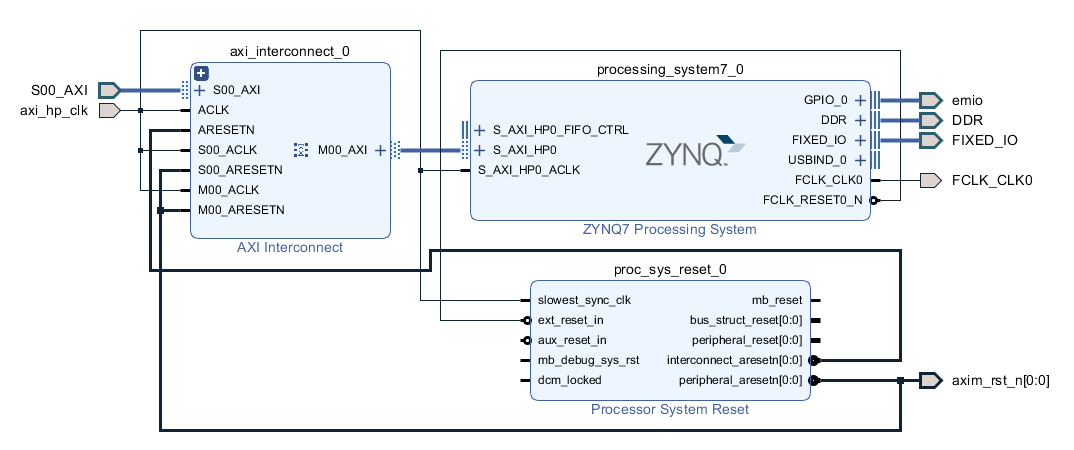 MIO (Multiplexed IO)是 PS 端提供的物理 IO 管脚,可以连接诸如 UART、SPI、I2C、GPIO 等,通过 Vivado 软件设置可以将信号通过 MIO 导出。也可以将信号通过 EMIO 连接到 PL 端的 FPGA fabric,再从 PL 的 I/O Bank 的管脚引出。EMIO 是 PS 端的信号(注意不是来自 PS 封装的 MIO 引脚)通过 AXI 接口暴露到 PL 侧的一组逻辑 GPIO 接口,来源是 PS 内部信号,是直接逻辑线,不是直接的物理引脚。这样的逻辑线接入 IOBUF 之后,才成为 PL 端可以实际操作的物理引脚。