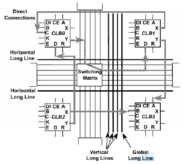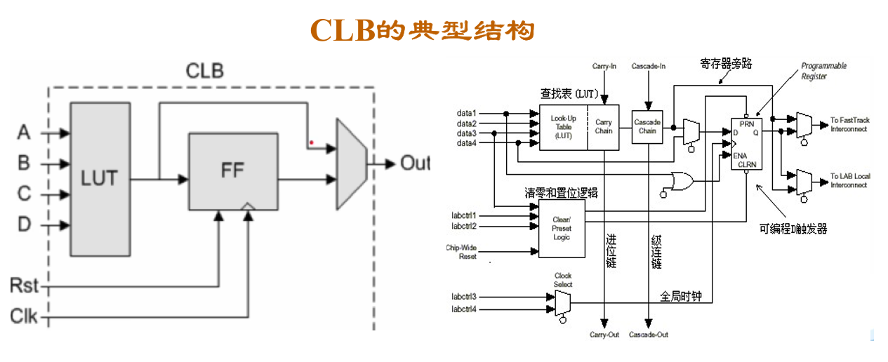FPGA 的结构由可编程输入/输出单元、基本可编程逻辑单元、嵌入式块 RAM、布线资源和 IP 内核单元几部分组成。CLB(Configurable Logic Block,可配置逻辑块) 是 FPGA 的编程部分,也称逻辑单元,配置时可以只对芯片中的部分 CLB 编程,因此一块芯片可以同时执行不同的功能,或以流水线的形式在不同时刻对数据做不同的处理,故 FPGA 拥有很高的并行度。同样由于这一特性,FPGA 的设计目标之一,就是用最少的 CLB 实现需要的逻辑函数。